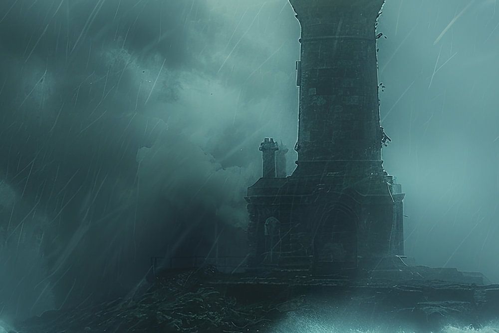 A dramatic image of a lighthouse surrounded by stormy sea waves and rainy, gloomy skies.