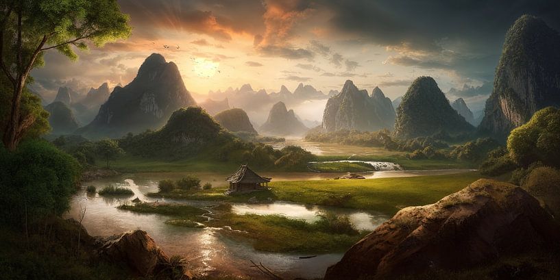 Buy this landscape artwork Mystical mountain landscapes among rice fields by Surreal Media on canvas, ArtFrame, poster and wallpaper, printed on demand in high quality.