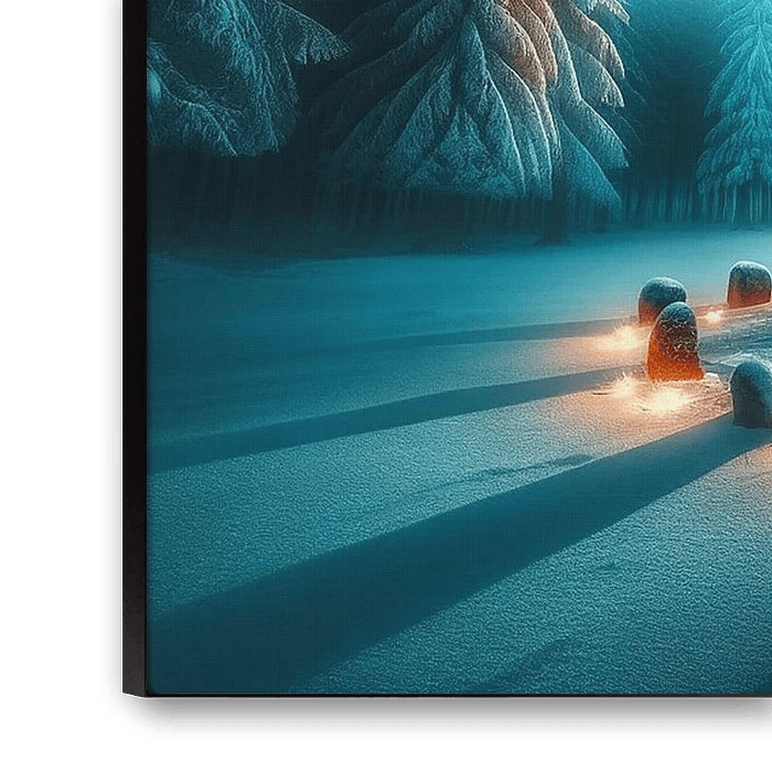 In this mystical scene, we witness a spectacular natural spectacle in a wintry landscape. In the centre stands a majestic, solitary oak tree, its sweeping branches stretching powerfully into the sky. It is surrounded by a circle of stones that seem like ancient guardians and radiate a mysterious glow. A breathtaking northern light arches above the tree, bathing the night sky in streams of turquoise and green light. Something otherworldly vibrates in the air - a large, glowing ring phenomenon in the sky, reminiscent of a portal to another world. The snow reflects the celestial glow, while the surrounding conifers are shrouded in silence and darkness. This composition not only captures the beauty of a winter landscape at night, but also touches on a sense of magic and the infinity of the universe.