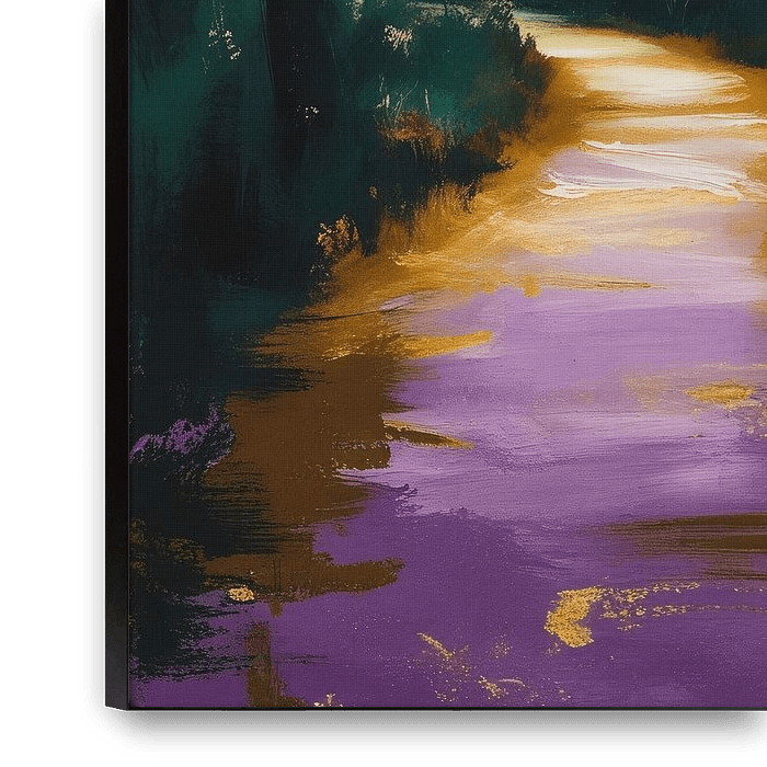This atmospheric digital artwork shows a mysterious forest path with a vibrant mix of green, gold and purple tones. The light falls softly through the trees, creating a magical and serene atmosphere. Perfect for those looking for an artistic and modern addition to a room. The painting exudes tranquillity and inspiration, making it ideal…