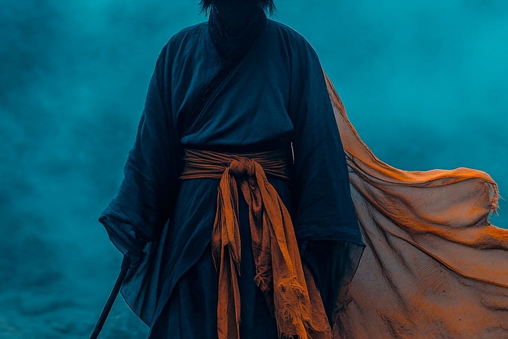 A mystical traveller walks through a misty landscape, his bright orange robe shimmering mysteriously in the cool light. The large hat protects him from the elements, while the stick in his hand provides stability. This impressive work of art brings a meditative calm to any living room and invites you to dream and reflect.