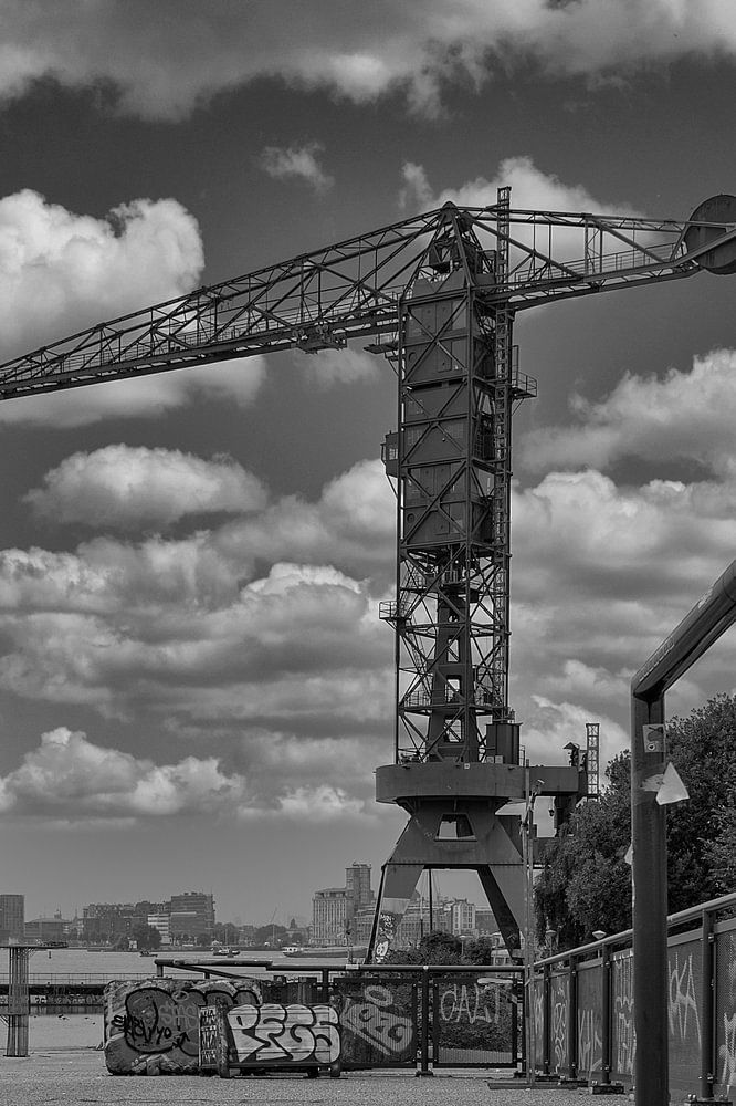 The former NDSM area in Amsterdam North with the characteristic crane, graffiti and old trams. In the background you can see the city centre of Amsterdam.