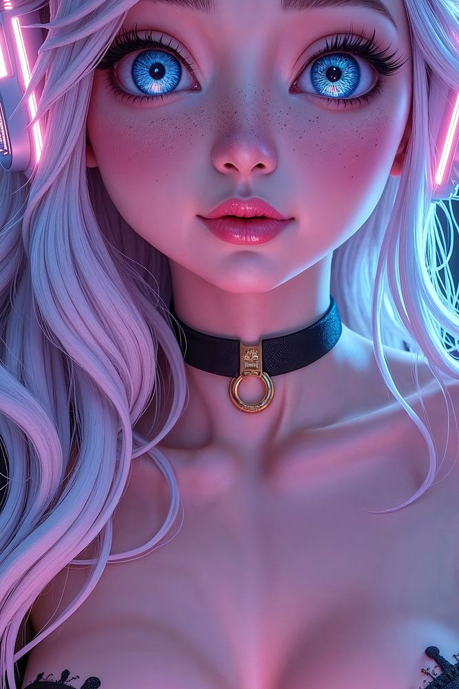 Bathed in glowing neon light, the figure sits focused in front of the screen, holding the controller firmly in her hands. The sexy anime gamer girl looks forward with bright, wide eyes, headphones framing her face as colorful lights transform the room into a vibrant gaming space. The moment feels close, intense, and deeply…