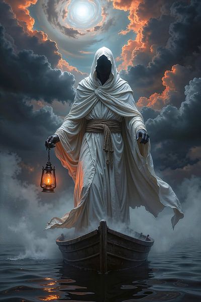 Buy this digital art artwork NOCTYREL - The hooded ferryman with a lantern in the sea of mist by INFERAURUM as a reproduction on canvas, ArtFrame, poster and wallpaper, printed on demand in high quality.