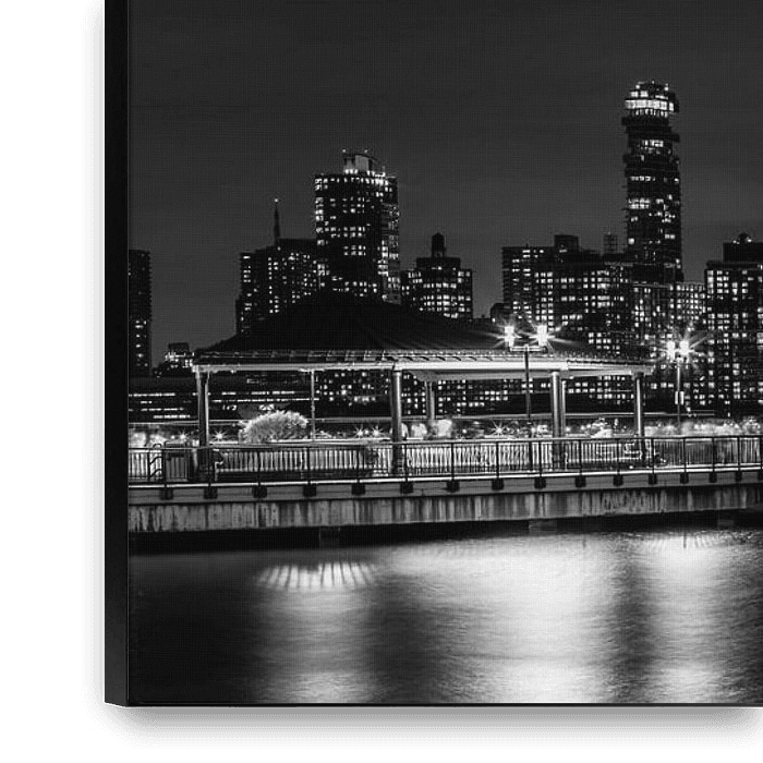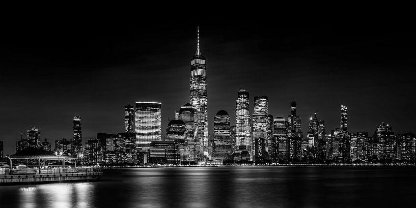 An impressive monochrome view from the Hudson River Walkway in Jersey City shows the skyline of Lower Manhattan at night. Thousands of lights bring the city to life, while the silhouettes of the skyscrapers stand out clearly against the evening sky. At the center, One World Trade Center dominates with its illuminated spire, accompanied…