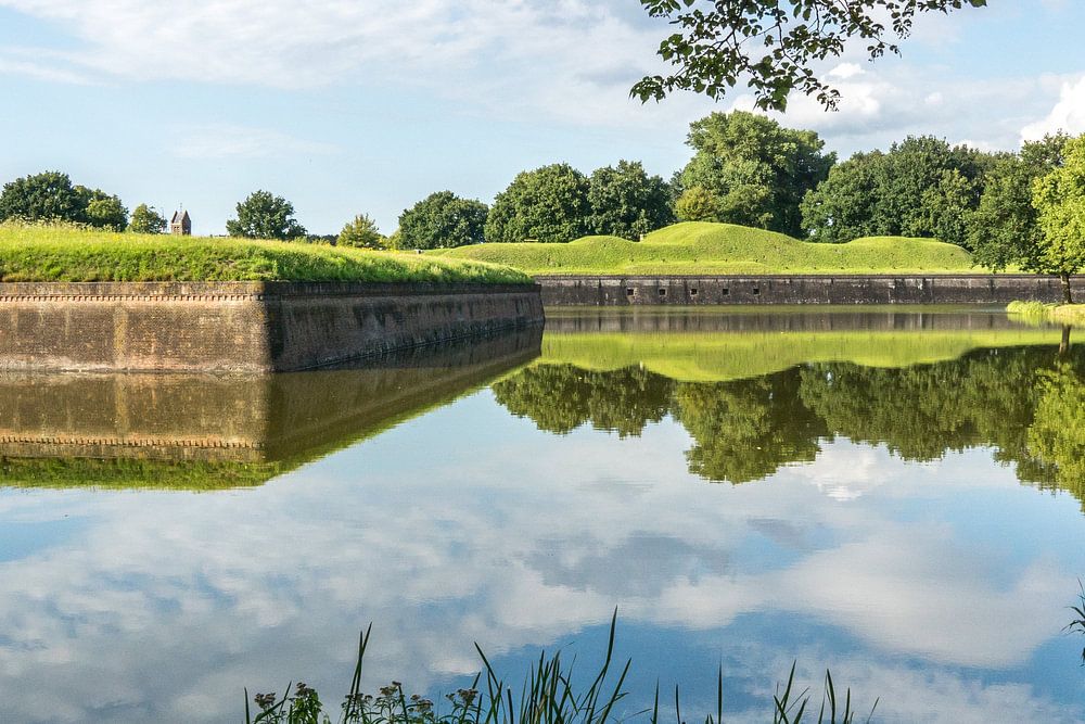 Outer moat of Naarden Vesting with the church tower in the background.