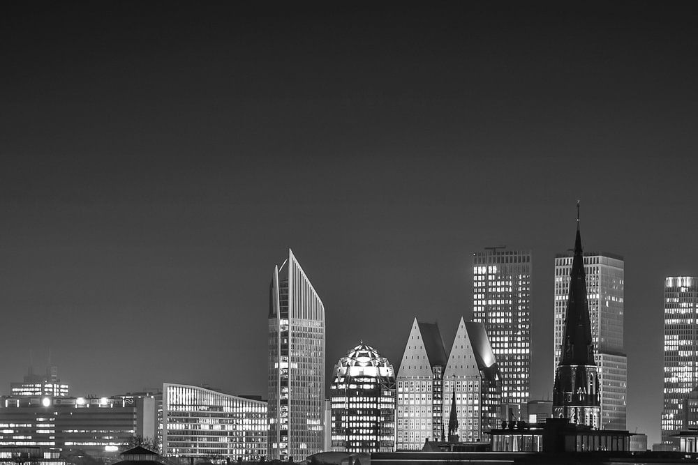 About "Nachtfoto van de skyline van Den Haag in zwart-wit"