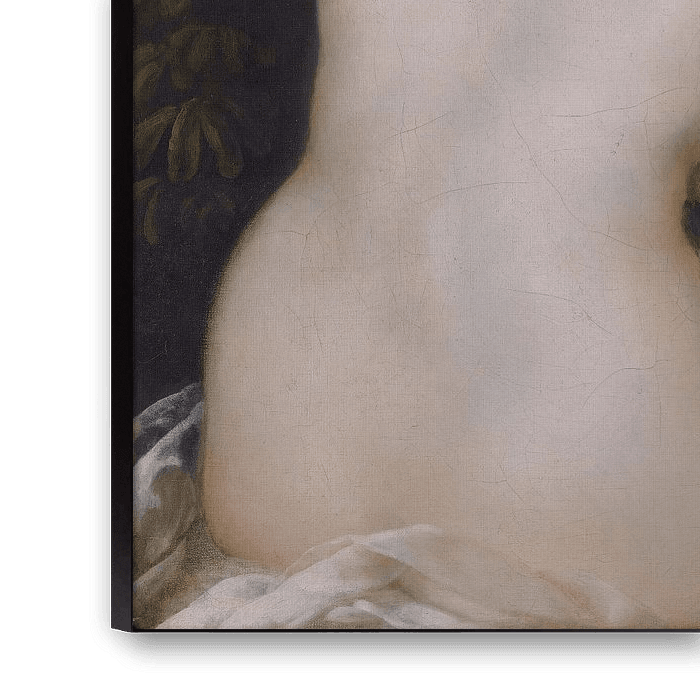 Nude portrait of a woman portrayed from behind. Because the girl is naked in this portrait, her thighs, hips, torso and a tit are exposed on this work of art.