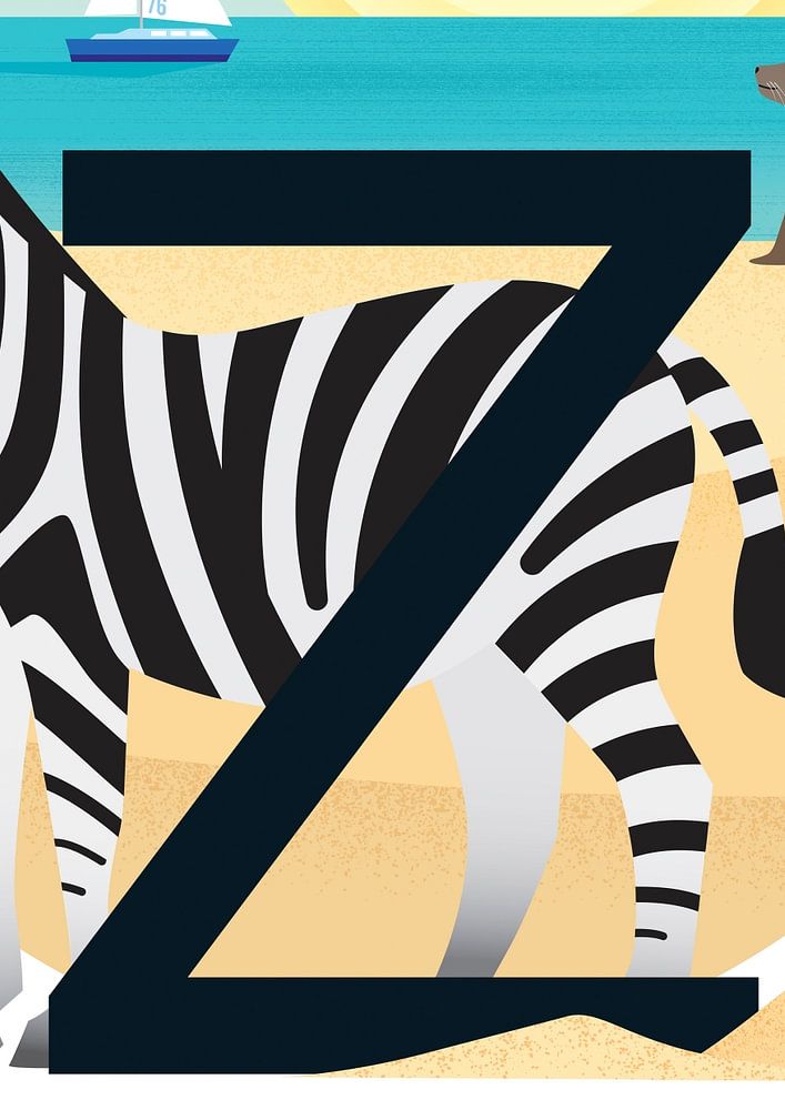 Everything with the Z. Find as many words as you can with the Z. See the zebra with black stripes on its side? On the sand is a starfish waving. A carefree sea lion is enjoying the sun. And on the sea sails a sailboat with a six and a seven on the sail. What a blissful summer!