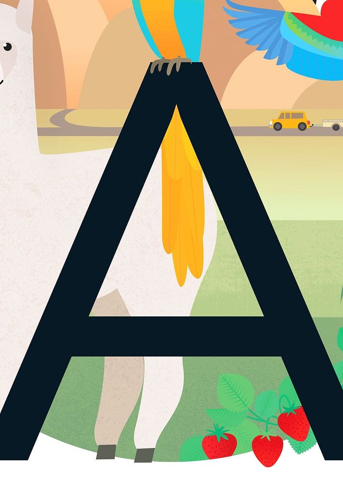 Everything with A. Find as many words with A as possible. An alpaca eating a spike. Two breathtaking macaws. The Andes. The Amazon. Cars and a trailer. And have you seen the strawberries yet?