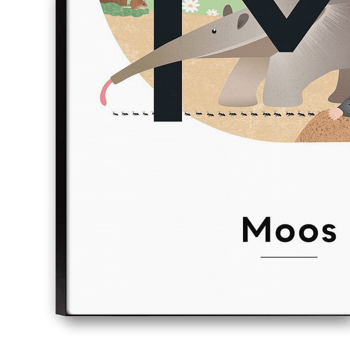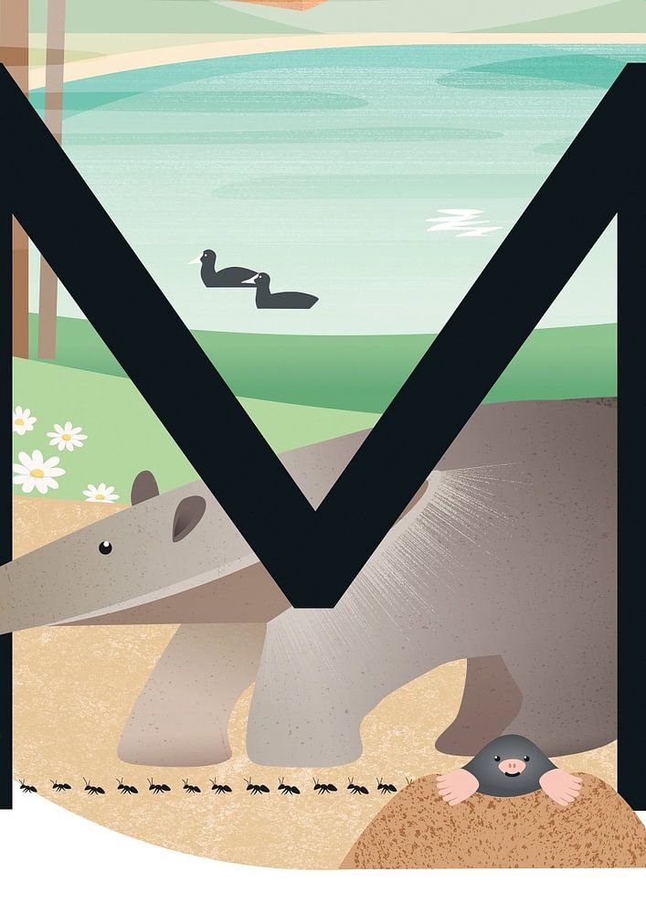 Anything with the M. Find as many words with the M. An anteater and a mole. A mouse and two coots on the lake. Despite the fog, you can see a walled mill. And in the sky is the moon. Can you also see the daisies and the moth? Fantasise and make up your own story. This poster can be ordered with a name on request, for example as an original maternity gift.
