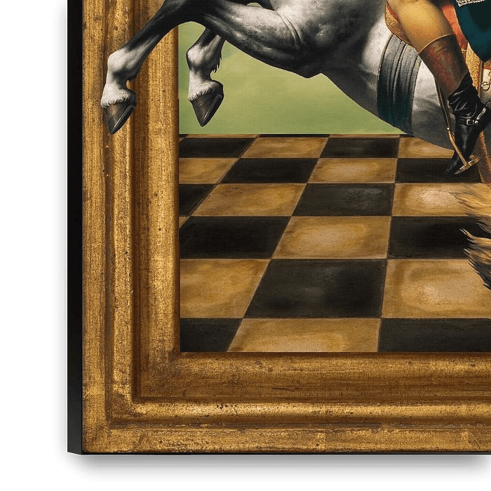 By making Napoleon and his horse rear up from the golden frame and adding shadows, I have turned the portrait into a Trompe-l'œil.