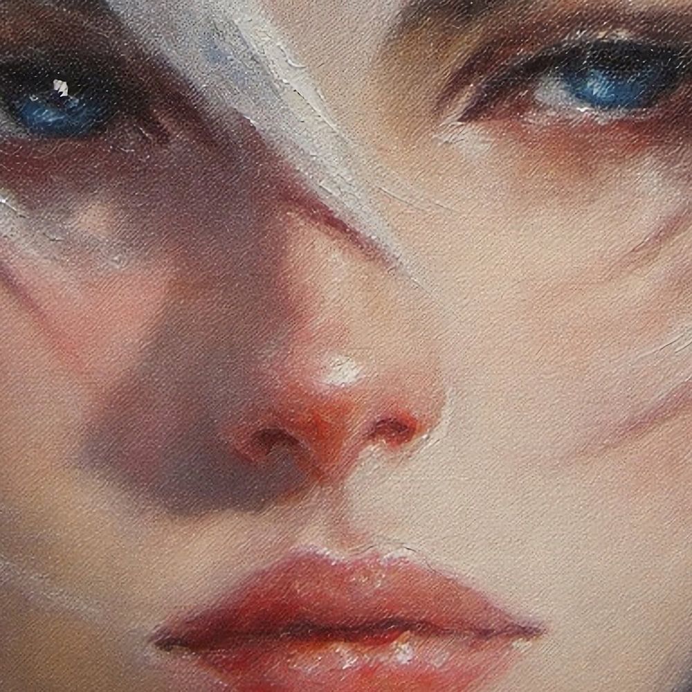 Her face fills the canvas: young but hardened. Her piercing blue eyes look straight at the viewer full of determination, pain, and something deeper still: a quiet, unyielding strength. Her cheeks are stained, her lips slightly open, and blonde locks blow wildly across her face as if the wind of a just-ended battle still hangs in her hair.