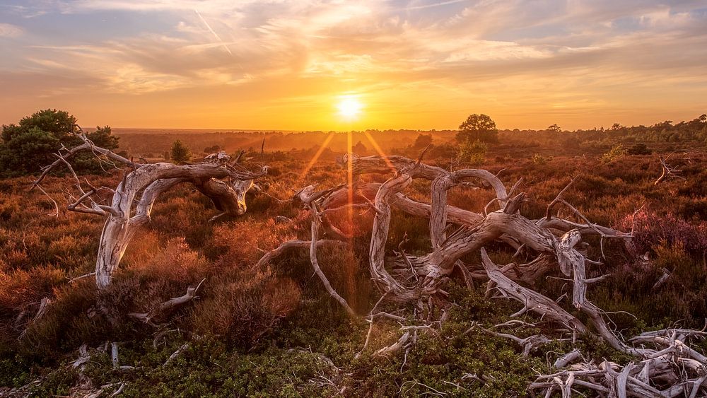 A beautiful colourful sunset on the "Holterberg", a beautiful piece of Dutch nature on the Sallandse Heuvelrug. The withered tree stumps in the foreground add a nice depth to the scene. I chose one of my favourite lenses here, the Voigtländer 12mm. This because of its enormous wide angle, which gives you a good impression of the vast landscape and because of the beautiful "sun-star" this lens produces.