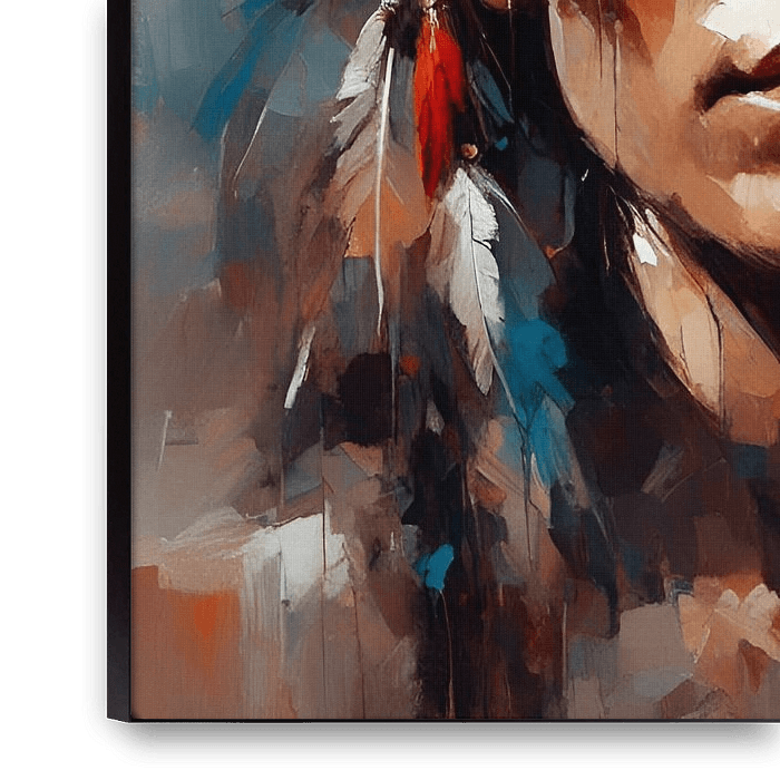 A detailed portrait captures the strong gaze of a woman adorned with a Native American headdress, highlighting a mix of cool and warm tones. The brushstrokes are expressive and dynamic, adding a textured effect to the subject's features.