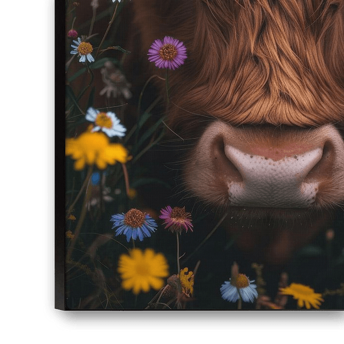 "Natural Charm" is a heartwarming portrait of a Scottish Highlander, serenely posing amid a colourful meadow full of flowers. The focus is on the animal's soft, warm gaze, enhanced by a garland of flowers resting playfully among the wild locks of its fur. This scene of pristine natural beauty, where flora and fauna come together in harmony, is an ode to rural simplicity. Ideal for interiors with a rural, bohemian or natural aesthetic, this artwork brings a touch of tranquillity and authenticity.