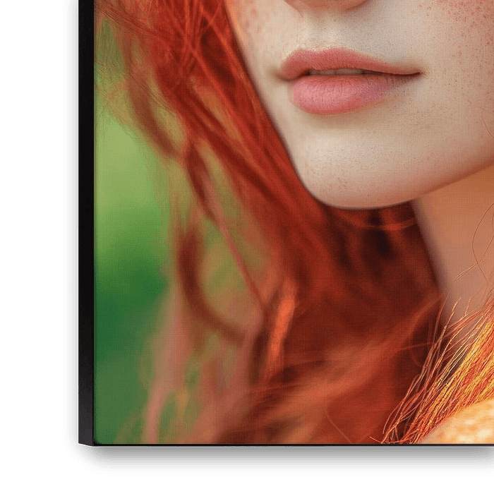 A touch of nature and grace radiates from this portrait with bright red hair and sparkling blue eyes. The refreshing floral wreath adds a romantic touch to the picture. Perfect for a bedroom or living room, it creates a harmonious, inviting atmosphere and attracts everyone's attention.