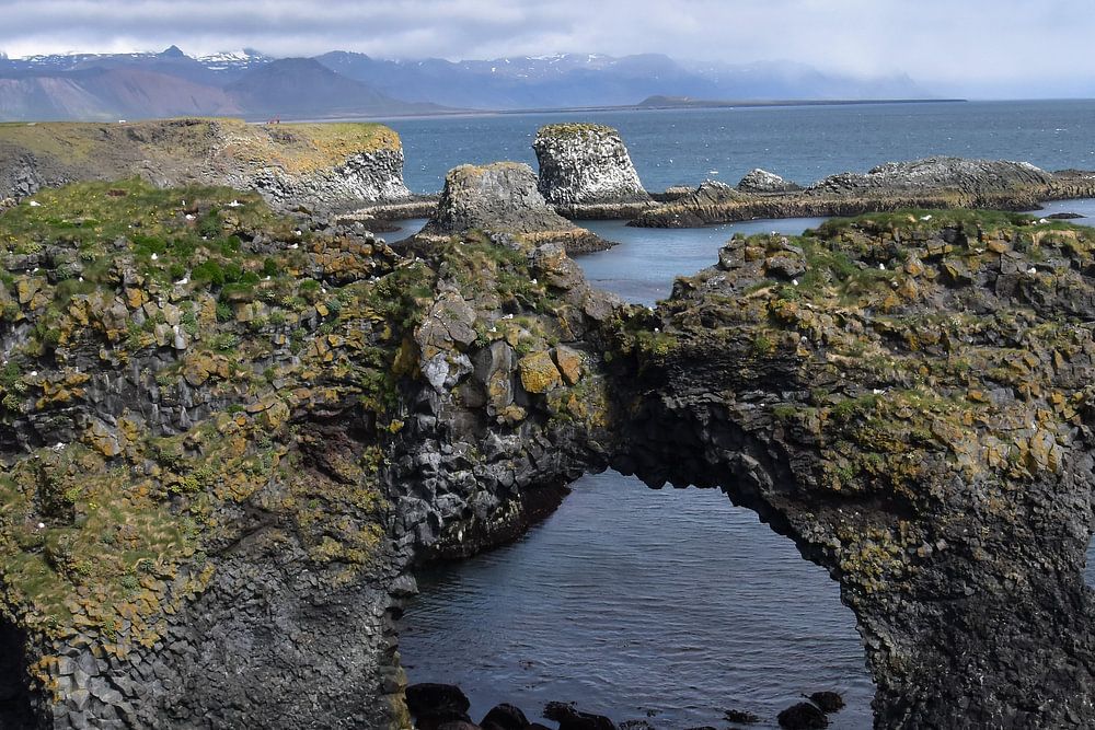 Route from Arnastapi to Hellnar. Beautiful rocky coast where many seabirds nest. Beautiful walking area with along the coast rock formations.