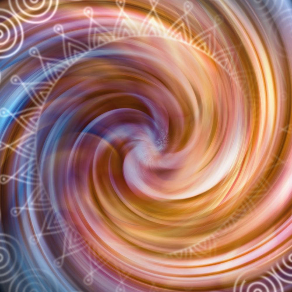 Natural elements fire and ice mixed in bright colors and connected by a mandala
