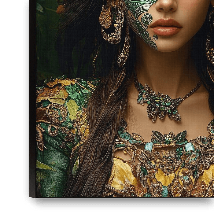 An enchanting portrait in which nature and mysticism merge in a lush composition. A decorative headdress of golden roses and exotic flowers crowns the image, while refined turquoise patterns and graceful ornaments decorate the skin. The rich gold and green tones, combined with delicate details in the jewelry and clothing, create an…