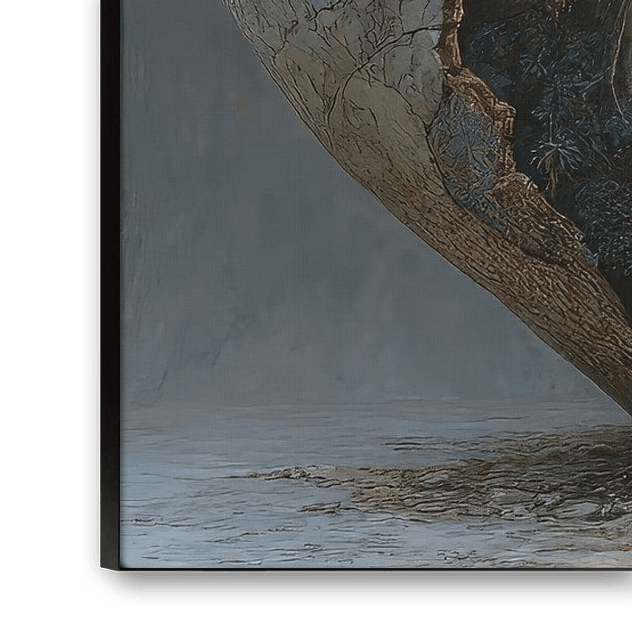 This painting tells a story of fragility and strength. Behind the weathered, cracked surface of a stone jar lies a hidden world: a majestic tree bathed in warm sunlight firmly anchoring its roots, symbolising life, growth and resilience.