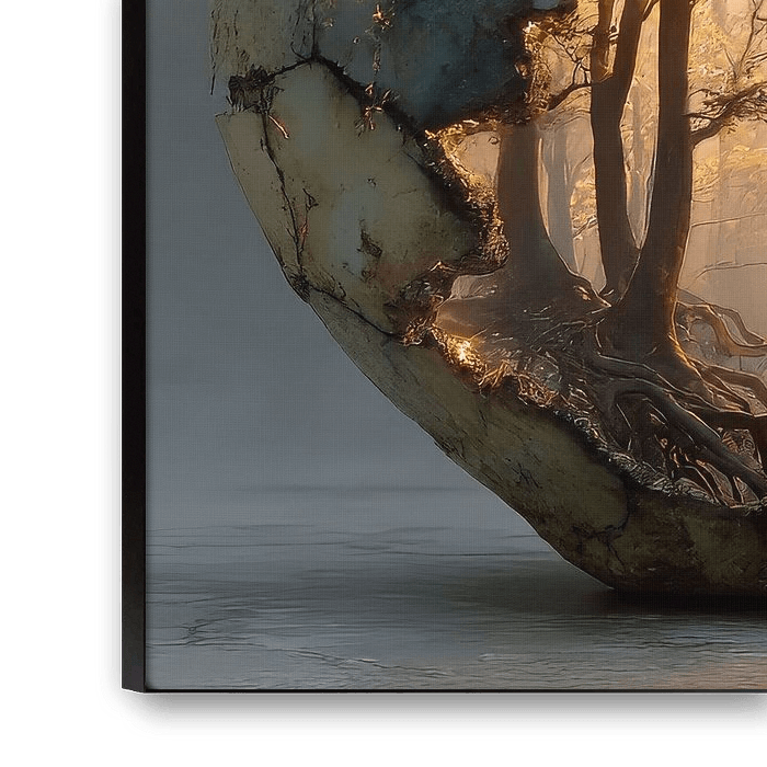This painting tells a story of fragility and strength. Behind the weathered, cracked surface of a stone jar lies a hidden world: a majestic tree bathed in warm sunlight firmly anchoring its roots, symbolising life, growth and resilience.