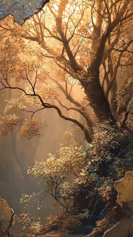This painting tells a story of fragility and strength. Behind the weathered, cracked surface of a stone jar lies a hidden world: a majestic tree bathed in warm sunlight firmly anchoring its roots, symbolising life, growth and resilience.