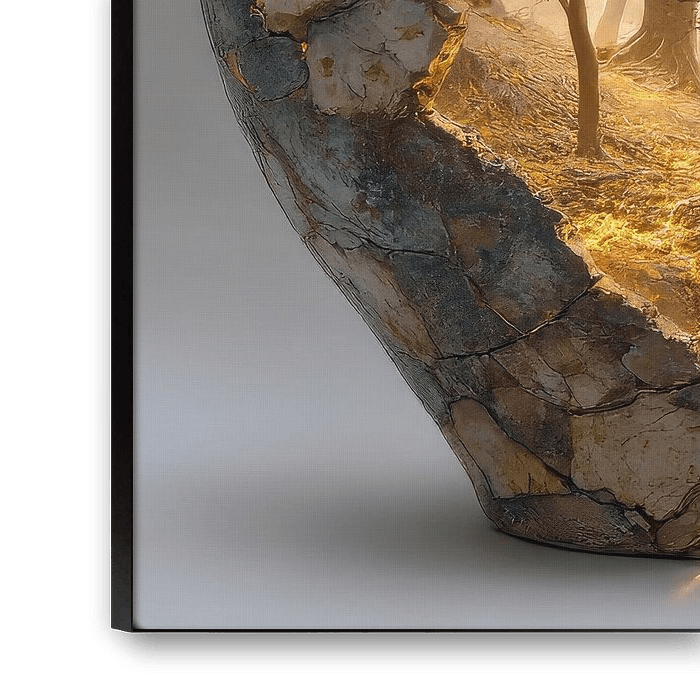 This painting tells a story of fragility and strength. Behind the weathered, cracked surface of a stone jar lies a hidden world: a majestic tree bathed in warm sunlight firmly anchoring its roots, symbolising life, growth and resilience.