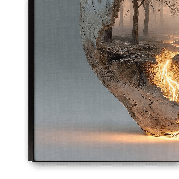 This painting tells a story of fragility and strength. Behind the weathered, cracked surface of a stone jar lies a hidden world: a majestic tree bathed in warm sunlight firmly anchoring its roots, symbolising life, growth and resilience.