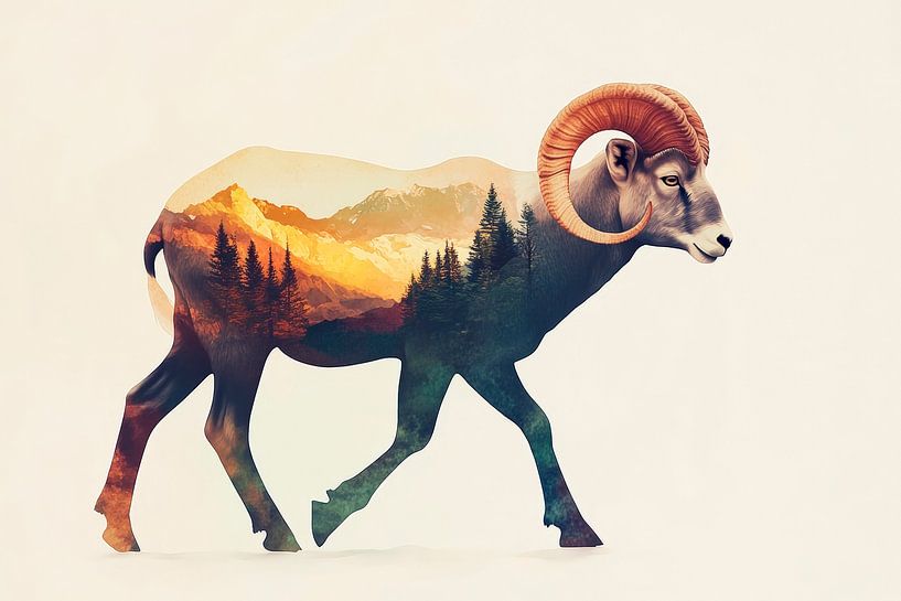 A majestic ram with curved horns, walking amidst picturesque mountain landscapes. The harmonious combination of nature and animal conveys a sense of adventure and freedom. Ideal for the living room, where it captures the eye as an impressive work of art and creates a calm, creative atmosphere.