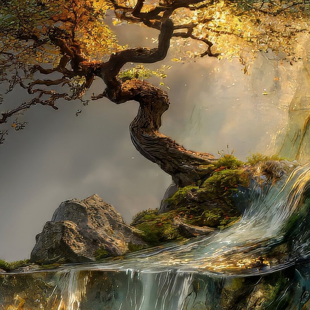 Beneath its branches, water flows down past rugged rocks, like a tranquil waterfall…