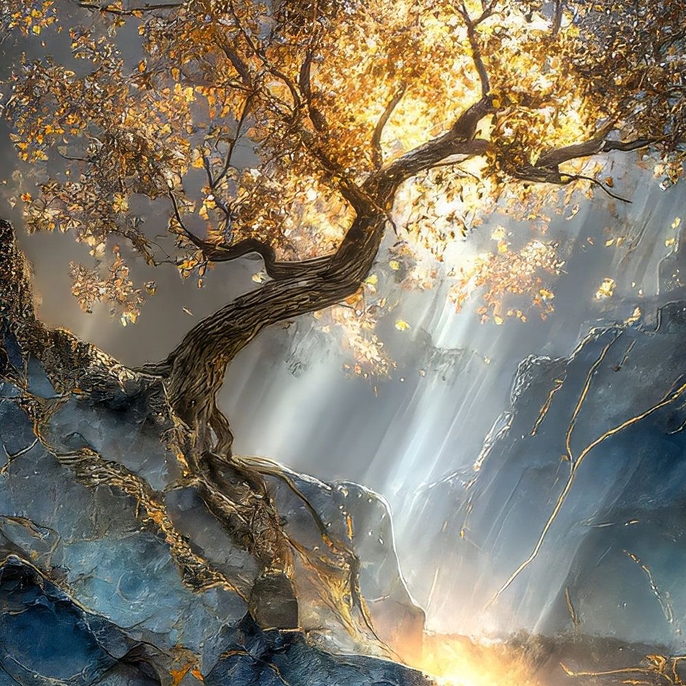 Beneath its branches, water flows down past rugged rocks, like a tranquil waterfall…