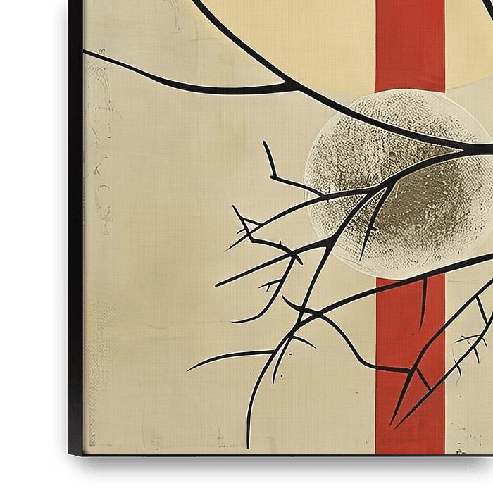 This abstract work of art impresses with its nature-inspired elements and harmonious colour scheme in red, black and beige. The filigree lines, reminiscent of branches, combine perfectly with the geometric shapes and create a unique visual depth. Ideal for creative spaces, offices and modern living areas that need to exude a touch of…