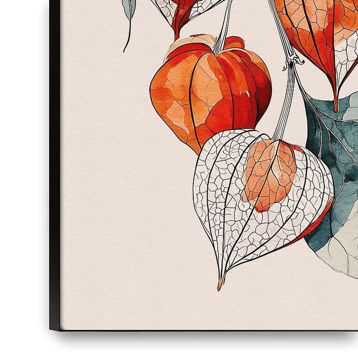 A refined botanical illustration of physalis (Chinese lantern plant) with vivid orange husks encased in translucent, veined shells. The interplay of watercolor softness and precise ink outlines captures both the fragility and resilience of nature