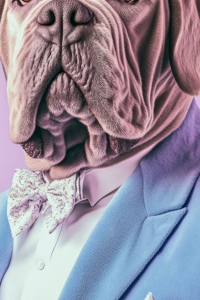 With his majestic, wrinkled face and an expression that exudes both dignity and charm, this Neapolitan Mastiff would be the epitome of an elegant gentleman. Wearing a blue suit with a stylish bow tie, he embodies the perfect mix of strength and sophistication, ready to fill any room with his presence.