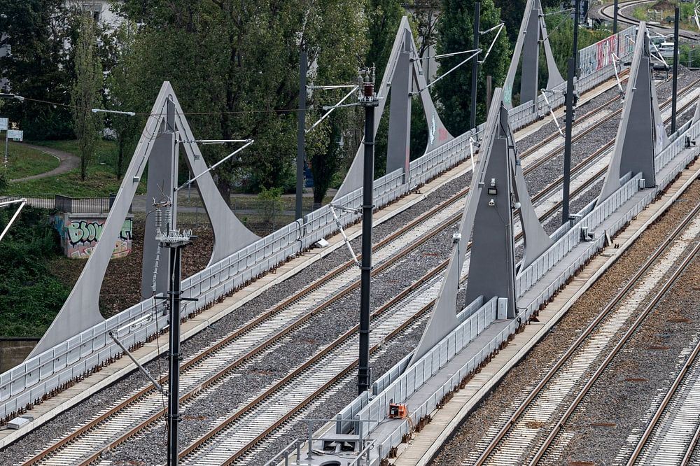 Stuttgart Baden Württemberg Germany Neckarbrücke Neckar Bridge, new rail bridge crossing the Neckar River as part of the Stuttgart 21 developments. bw, traffic, transport, rail, local, engineering, constration, bahn,