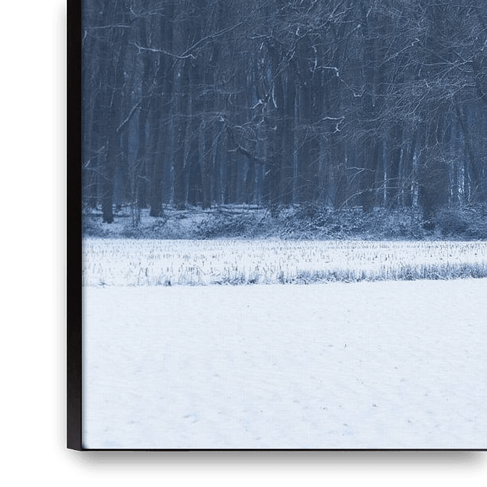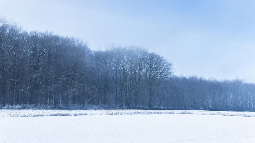 A striking winter panorama of Neigem Forest, near Ninove, in East Flanders, Belgium, where the snow-covered landscape creates a serene and ethereal scene. The barren trees contrast starkly with the open field which is blanketed in snow. A beautiful tranquil and minimalist landscape in the Flemish Pajottenland.