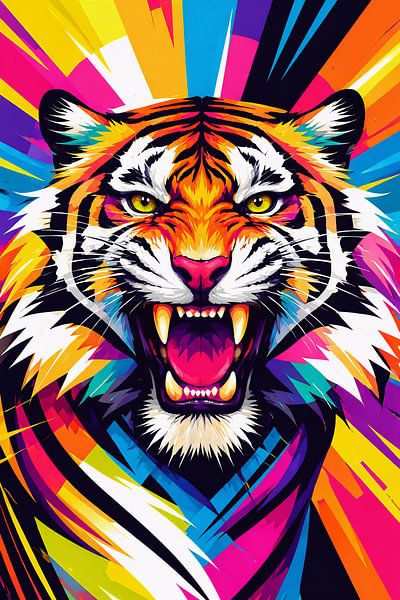 This striking pop art illustration features a roaring tiger rendered in bold neon colors and dynamic geometric strokes. The vibrant composition explodes with energy, combining intense color contrasts with sharp graphic elements that emphasize the tiger’s strength, power, and fearless spirit.