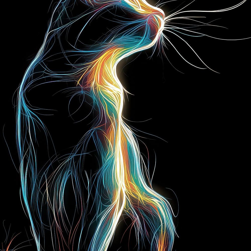Neon cat line painting is a striking artwork that combines the graceful forms of a cat with a modern neon style against a black background. The cat's sharp, flowing lines contrast beautifully with the dark background, further highlighting the vibrant neon colours. This gives the painting a dynamic and energetic look that instantly grabs…