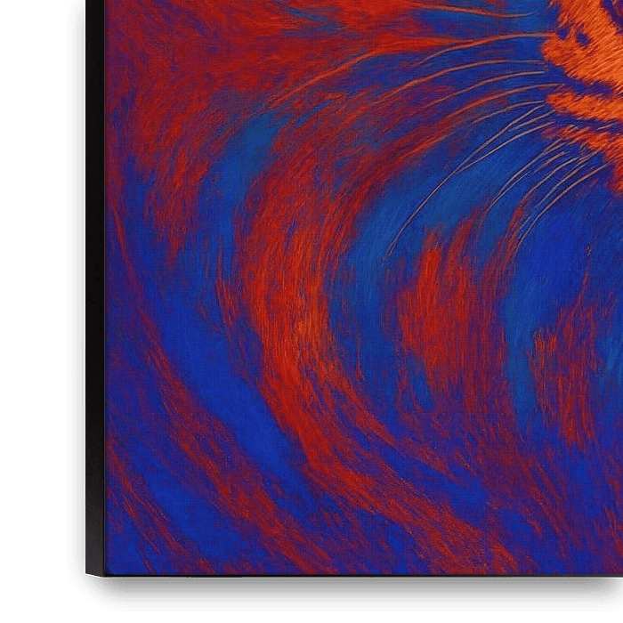 A fiery leopard head with amber eyes dominates the composition, while a bright blue rabbit rests in profile in front. Wavy brush-like bands mix warm red and orange accents with cool cobalt blue, creating a powerful complementary contrast. The panther's fur shows dots and soft transitions, contrasting with the rabbit's clean contour and…