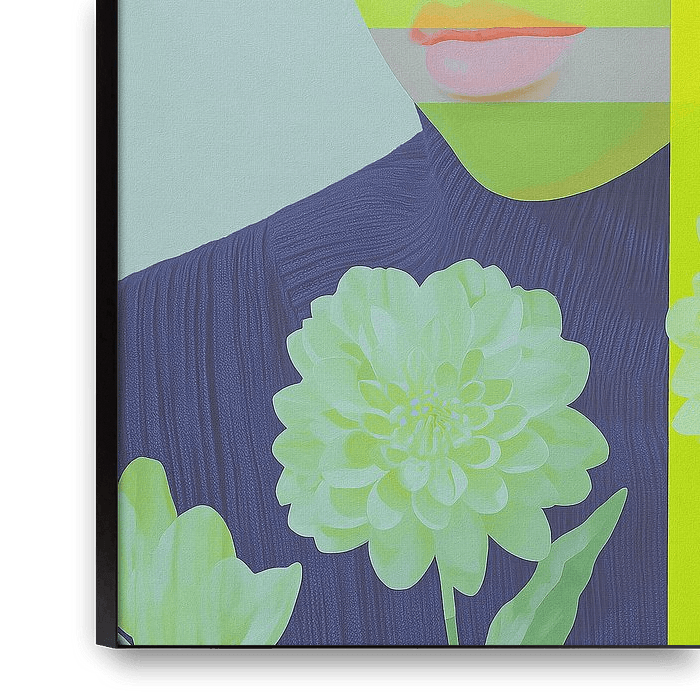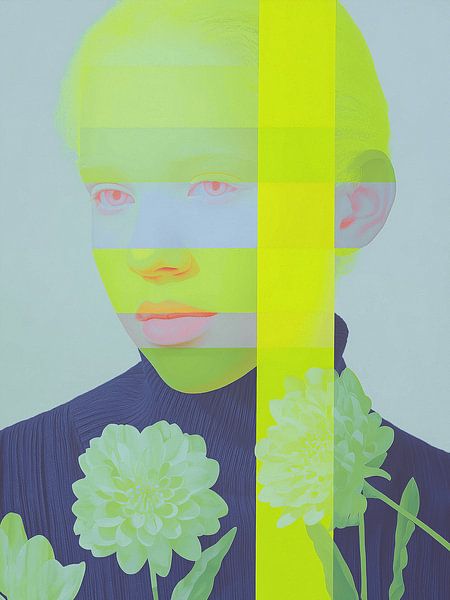 Runa is a modern, abstract portrait of a young woman merging graphic forms and floral elements. The face emerges from large flowers and flowing areas of colour in neon accents, combined with soft greys and warm yellows. The use of transparency, overlapping and soft colour transitions creates depth and a layered composition. The balance…