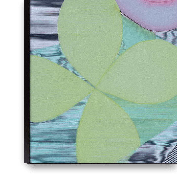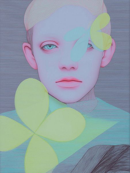 [NAME] is a modern, abstract portrait of a young woman merging graphic forms and floral elements. The face emerges from large flowers and flowing areas of colour in neon accents, combined with soft greys and warm yellows. The use of transparency, overlapping and soft colour transitions creates depth and a layered composition. The…