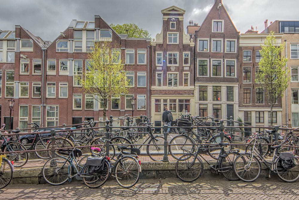 Amsterdam Every family has several bikes. This picture clearly shows what this means for the street. The image shows numerous bicycles parked on the bridge at the Looiersgracht. In the background are beautiful canal houses that Amsterdam is famous for.