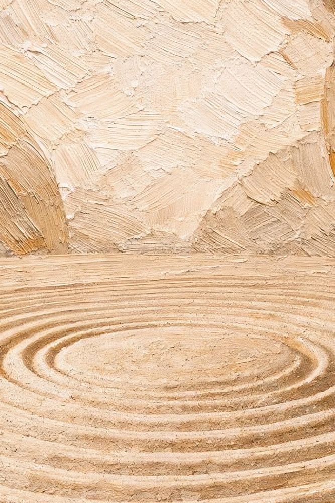 This abstract artwork features layered textures in warm neutral tones, combined with soft circular patterns inspired by zen sand gardens. The composition creates a sense of balance, rhythm, and quiet movement, inviting calm contemplation. Subtle brush strokes and earthy colors add depth and tactility, making the piece both visually…
