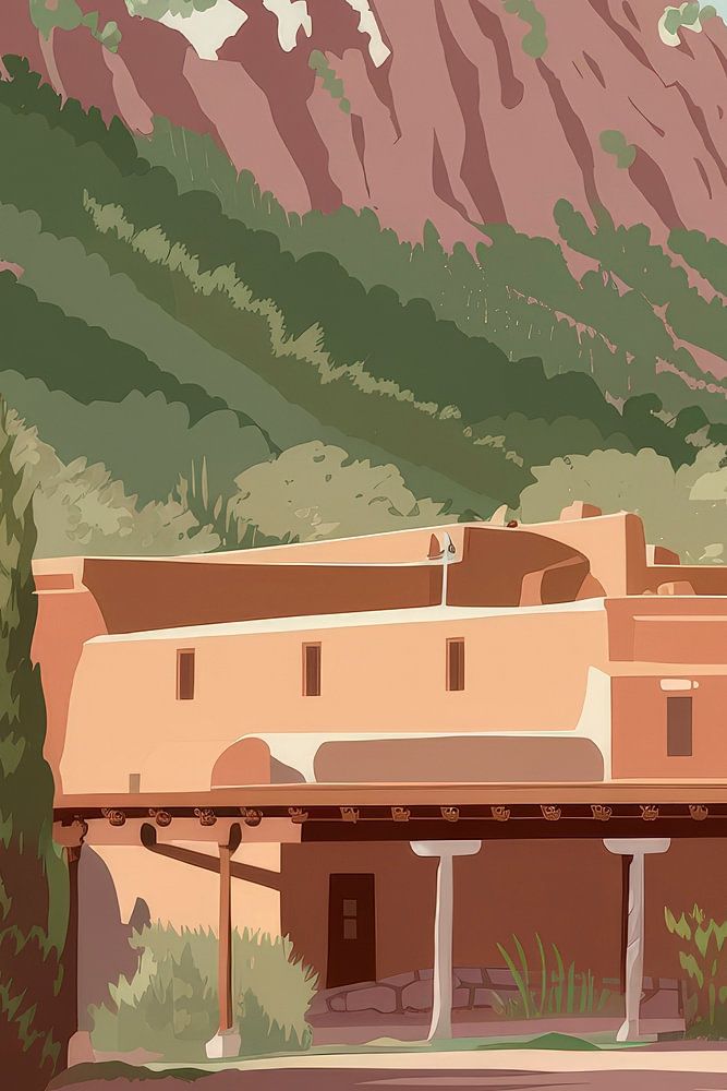The soft earth tones and the majestic mountain in the background create a calm, inviting atmosphere. The architectural details of the southwestern ranch evoke the captivating culture of New Mexico. Perfect for the living room, this artwork brings a slice of nature and adventure into your home and provides cosy conversation and inspiration.