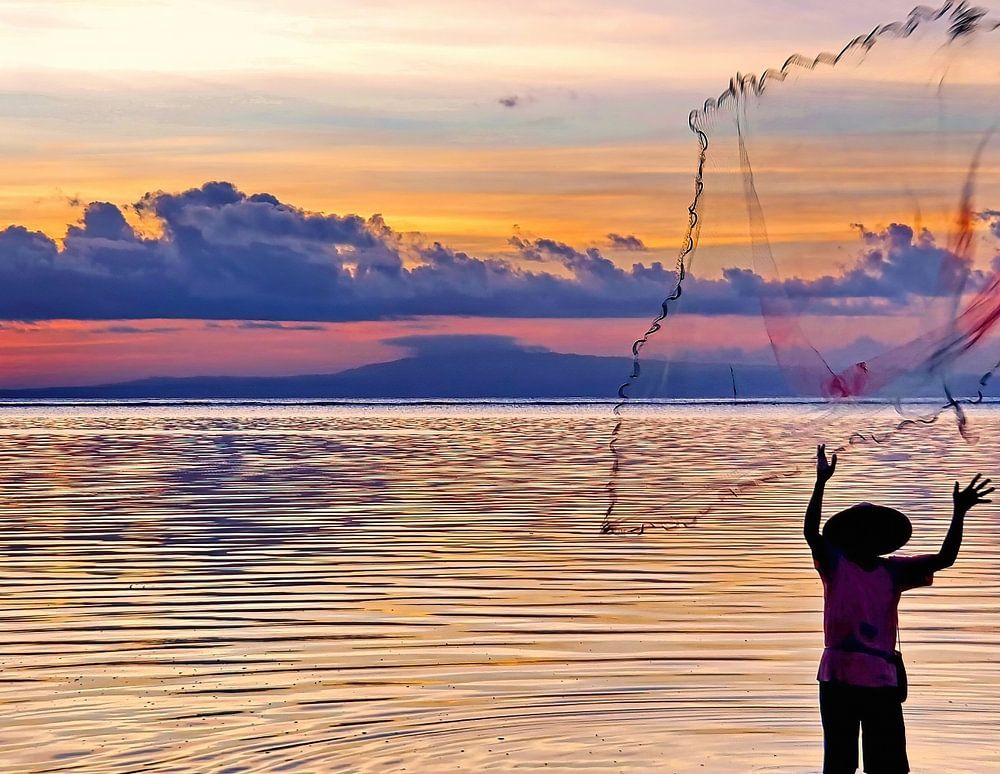 Fisherman in Sanur, South Bali, throws out his throwing net at rising sun.