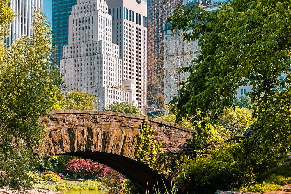 In the foreground, the Gapstow Bridge in New York's Central Park.