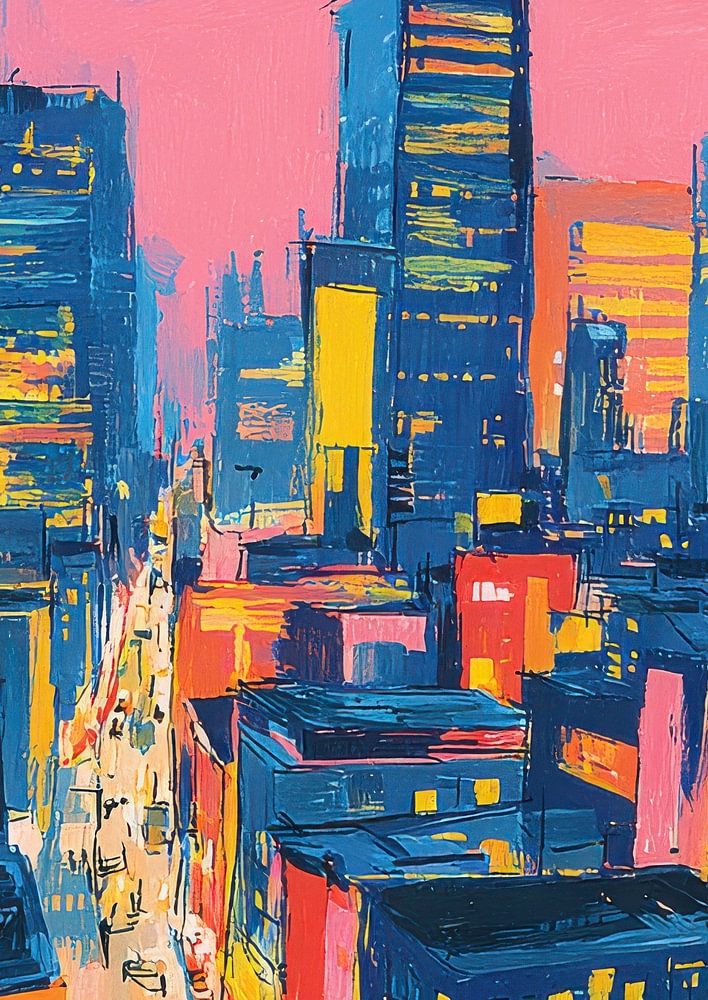 This oil painting shows New York City in a colourful cartoon style at sunset. Tall buildings, including a yellow house, glow in shades of blue and pink, while streets full of cars and neon lights animate the city. With clear, minimalist shapes, visible brushstrokes and vibrant colours, the work conveys the pulsating energy of the city. The sweeping views of the skyline, the glowing city lights and the dynamic street scene capture the urban life of New York. Ideal for lovers of modern, impressionistic cityscapes and colourful, playful oil paintings.