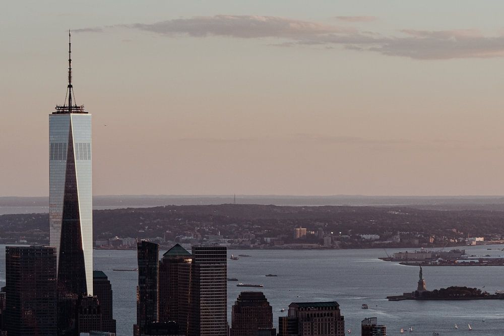 A beautiful sunset combined with the New York City skyline captured. The Statue of Liberty can be seen in the background.