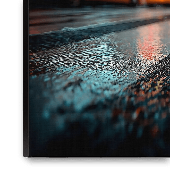 The low angle and depth of field create a strong sense of perspective. The wet tarmac reflects the city…